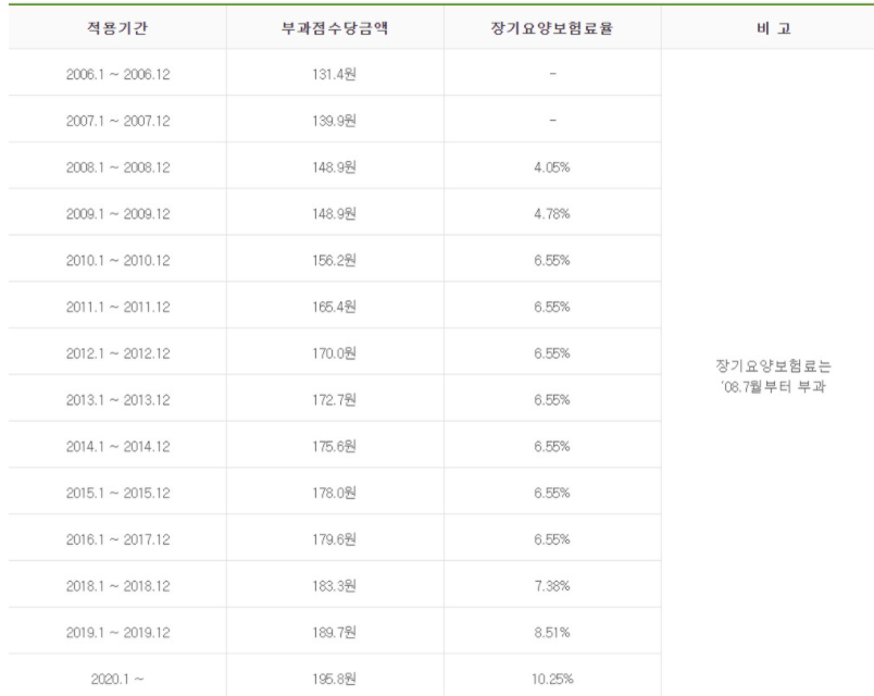 - 연도별 건강보험료 부과점수당 금액 및 장기요양 보험료율