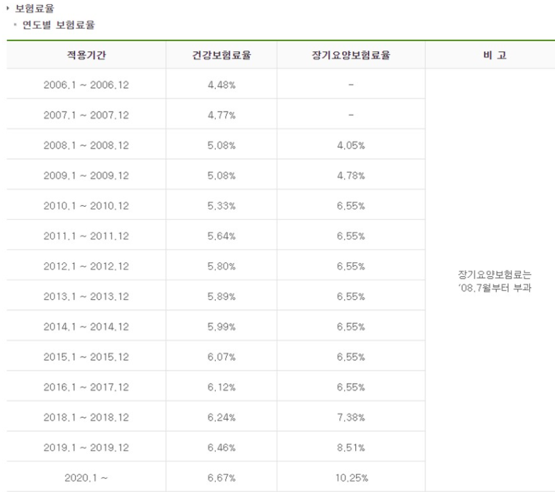 ● 장기요양보험료 = 건강보험료 × 장기요양 보험료율(10.25%, 2020년도)